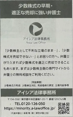 アイシア法律事務所の新聞・雑誌・メディア掲載情報 新聞掲載:日経新聞2025年8月29日付」掲載(少数株主サイト) (出典:日本経済新聞(2025年8月29日付)) 日本経済新聞(2025年8月29日付)の広告企画「少数株主(非上場)側として頼れる5法律事務所」に、当事務所の少数株主向け特設サイトが掲載されました。少数株式の売却・交渉に関するご相談は、特設サイトの案内をご覧ください。 (参考)少数株主の不安を解決!非上場株式の売却... 2025年8月29日 アイシア法律事務所
